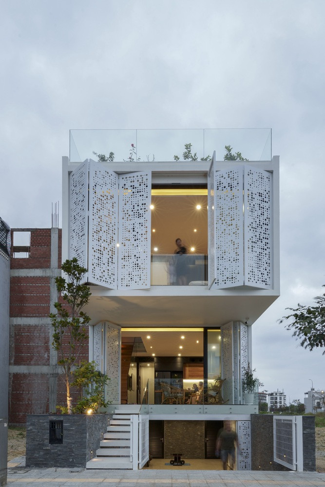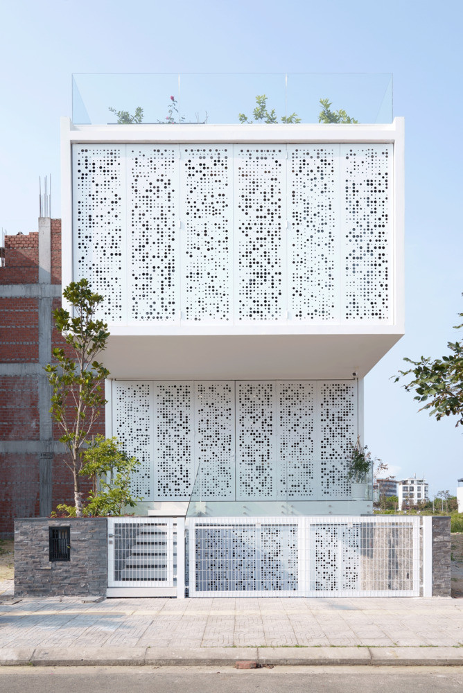 Căn nhà 2 tầng được thiết kế với hạn chế bức xạ mặt trời bằng các hệ lam thép được khoét lỗ, gió có thể đi qua, luân chuyển khí tươi.