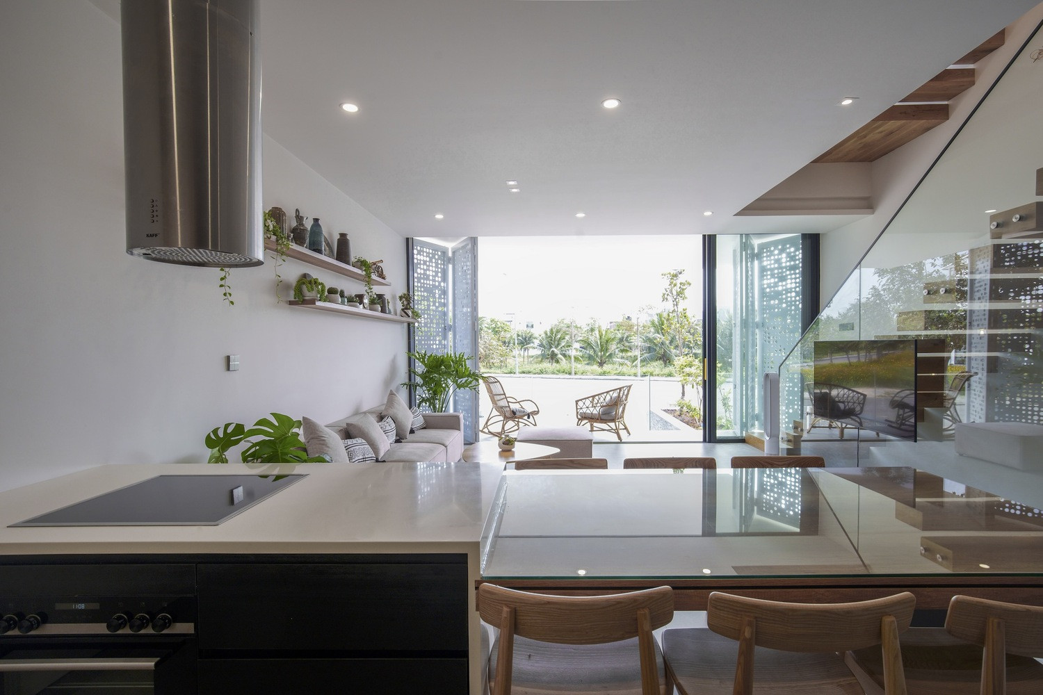 Ngôi nhà 2 tầng được thiết kế nhằm hạn chế bức xạ mặt trời bằng các hệ lam thép được khoét lỗ để gió có thể đi qua, từ đó khí tươi được luân chuyển liên tục vô cùng ấn tượng.