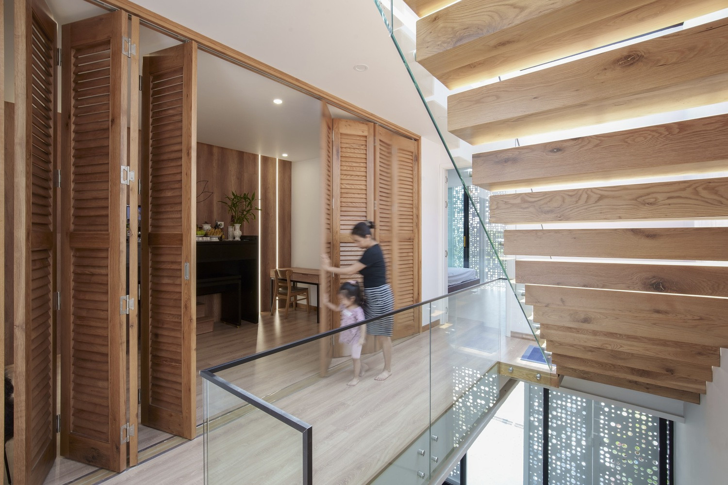 Tầng 2 có hai phòng ngủ, tuy chiều dài khu đất khá hạn chế nhưng với cách bố trí nhiều giếng trời và cửa tự động để lấy sáng thì các phòng ngủ và vệ sinh luôn thông thoáng và dễ chịu.