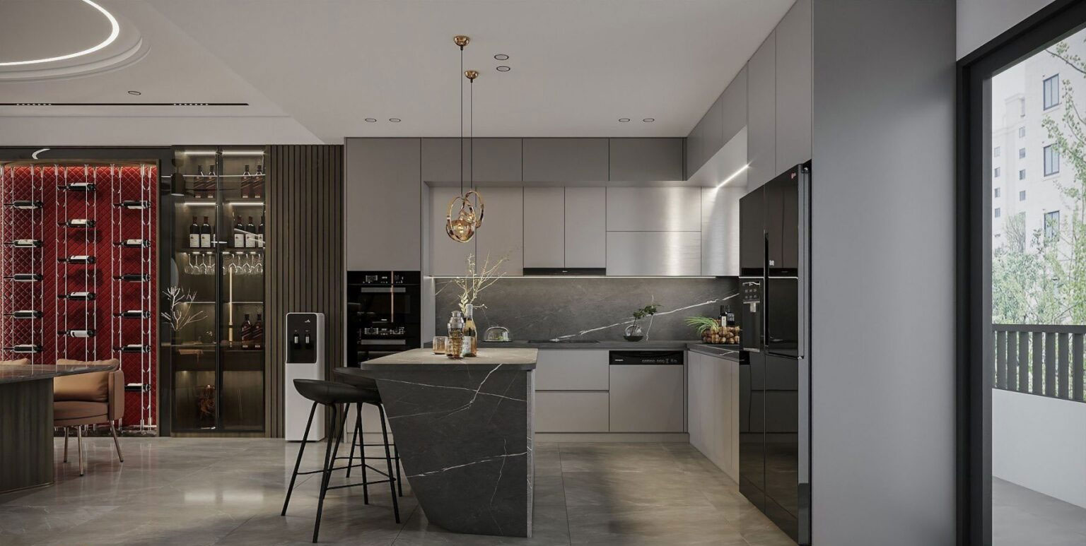 Thiết kế nội thất phòng bếp biệt thự bên cạnh việc phô ra những đường nét tinh tế, thể hiện đẳng cấp của loại hình nhà biệt thự còn đảm bảo tính hài hòa, đồng điệu với phong cách chung của căn nhà, đem đến sự ngăn nắp, gọn gàng. Thiết kế không gian mở giữa các khu vực trong nhà, nội thất và ngoại thất tạo nên sự kết nối, giúp không gian thêm rộng rãi, thoáng đãng. Để khéo léo trong việc đảm bảo sự riêng tư cho người nội trợ, KTS đã bố trí bàn đảo bếp, đặt bàn ăn ở giữa như vách ngăn giữa phòng khách và phòng bếp.