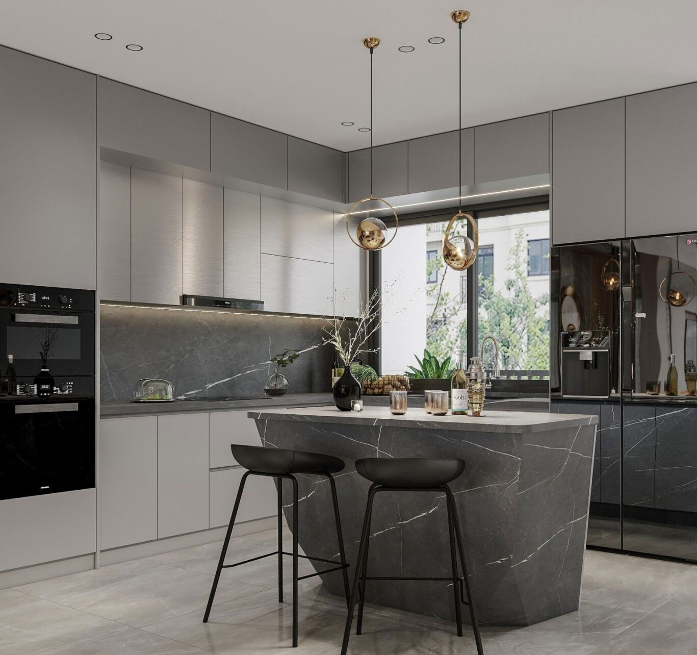 Phòng bếp thiết kế bàn đảo giúp cho căn phòng trở nên tinh tế, sang trọng, lịch sự hơn. Khi bố trí bàn đảo như vậy gia chủ có thể tận dụng để chứa đồ, hay làm bàn ăn nhanh cho các thành viên trong gia đình.